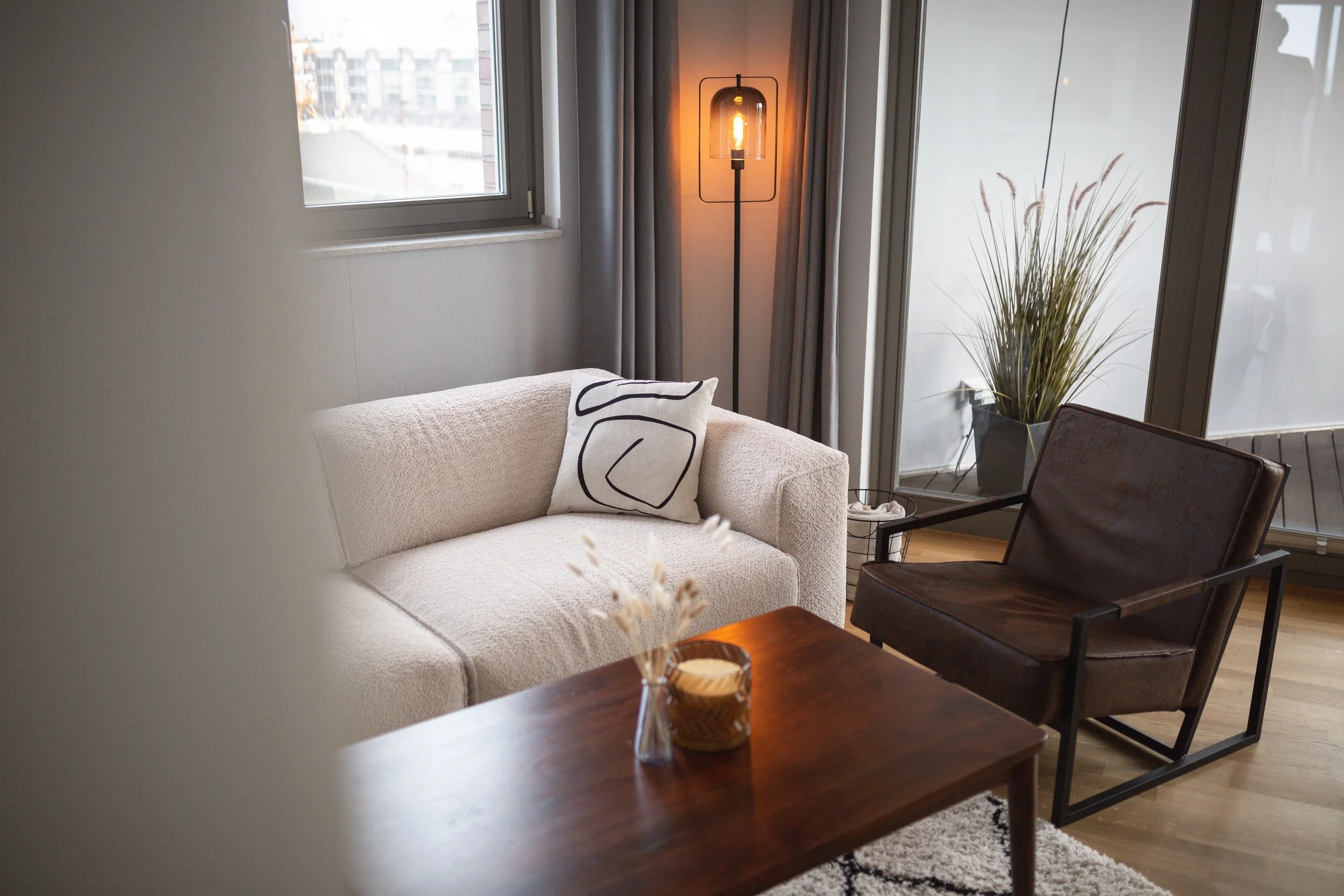 Für einen entspannten Abend empfiehlt sich der Nordbalkon, der an das zweite Wohnzimmer angrenzt, das auch als Büro oder weiteres Schlafzimmer genutzt werden kann. Hier kannst du atemberaubende Sonnenuntergänge genießen und von den gemütlichen Loungemöbeln aus die beleuchtete Skyline der Stadt betrachten.